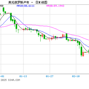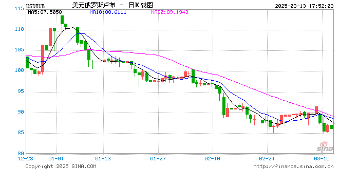 03月13日 美元兑俄罗斯卢布跌破86.1000 折算100俄罗斯卢布汇率兑8.3400人民币