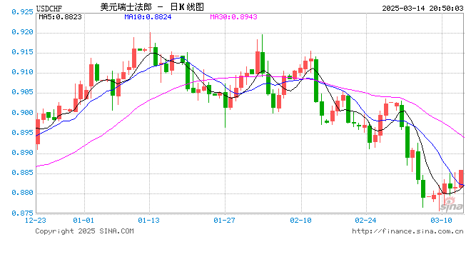 新浪外汇消息2025年03月14日,截至20时49分,外汇市场上美元兑瑞士法郎汇率突破1美元兑换0.8858瑞士法郎。涨幅为0.5003%