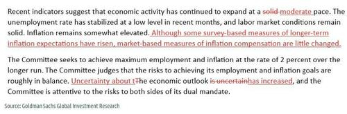高盛提到,FOMC声明的变化可能会承认近期经济活动增长放缓、基于调查的通胀预期上升以及经济前景的不确定性增加。