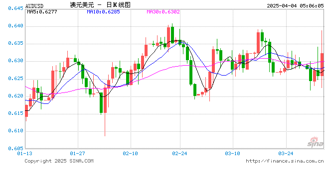 新浪外汇消息2025年04月04日,截至05时05分,外汇市场上澳元兑美元汇率突破1澳元兑换0.6324美元。涨幅为1.0789%