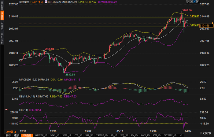 汇通财经APP讯——周五(4月4日)欧市盘前,现货黄金承压回落,当前交投于3100美元附近。不过多项技术指标显示当前回调空间有限,短期内或迎来反弹。全球地缘政治风险升温及美联储降息预期继续为金价提供支撑。