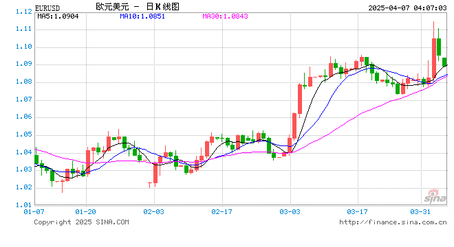 新浪外汇消息2025年04月07日,截至04时06分,外汇市场上欧元兑美元汇率跌破1欧元兑换1.0895美元。跌幅为-0.5686%