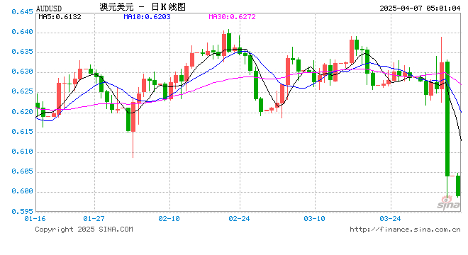 新浪外汇消息2025年04月07日,截至05时00分,外汇市场上澳元兑美元汇率跌破1澳元兑换0.5991美元。跌幅为-0.8227%
