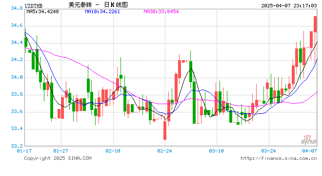 新浪外汇消息2025年04月07日,截至23时16分,外汇市场上美元兑泰铢汇率突破1美元兑换34.7000泰铢。涨幅为1.0189%