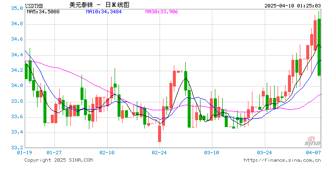新浪外汇消息2025年04月10日,截至01时24分,外汇市场上美元兑泰铢汇率跌破1美元兑换34.1400泰铢。跌幅为-2.0373%