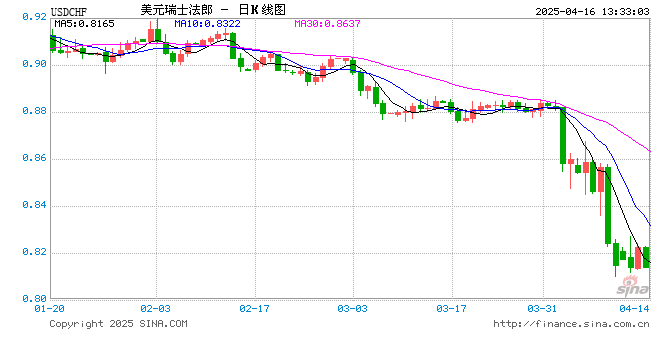 新浪外汇消息2025年04月16日,截至13时32分,外汇市场上美元兑瑞士法郎汇率跌破1美元兑换0.8140瑞士法郎。跌幅为-1.0286%