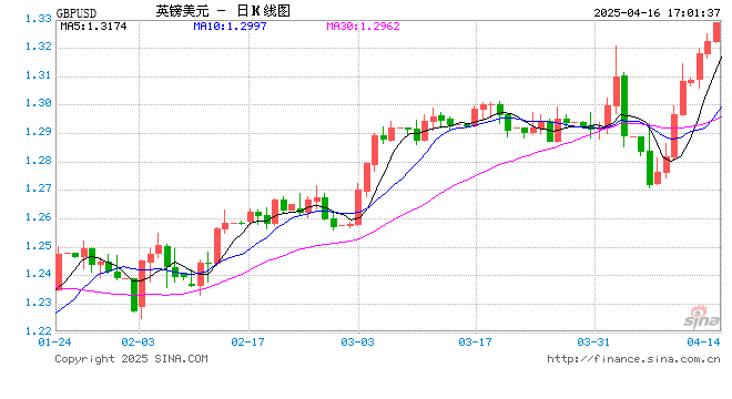 新浪外汇消息2025年04月16日,截至17时01分,外汇市场上英镑兑美元汇率突破1英镑兑换1.3291美元。涨幅为0.5089%