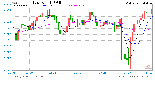 新浪外汇消息2025年04月21日,截至11时34分,外汇市场上澳元兑美元汇率突破1澳元兑换0.6410美元。涨幅为0.5348%