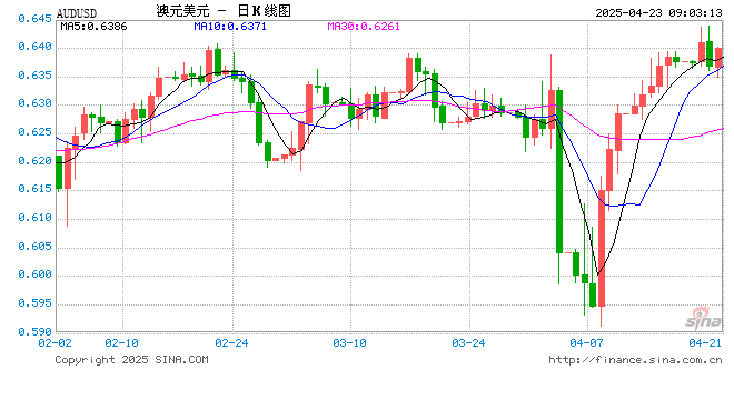 新浪外汇消息2025年04月23日,截至09时01分,外汇市场上澳元兑美元汇率突破1澳元兑换0.6401美元。涨幅为0.5103%