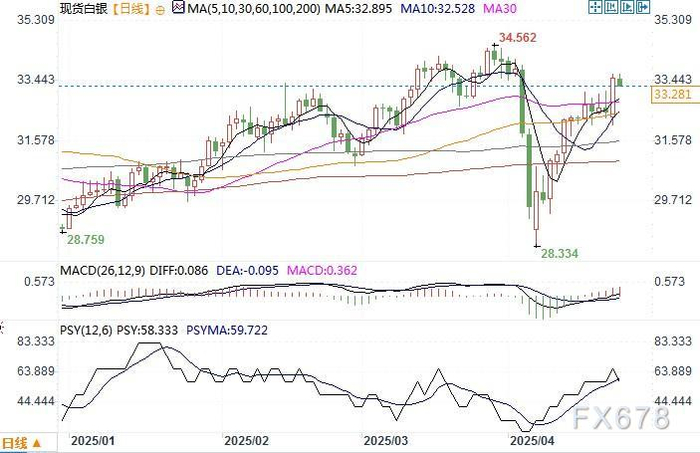 现货白银日线图 来源:易汇通北京时间4月24日11:50 现货白银 报 33.28美元/盎司