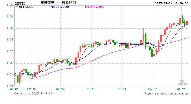 新浪外汇消息2025年04月24日,截至19时29分,外汇市场上英镑兑美元汇率突破1英镑兑换1.3320美元。涨幅为0.5025%
