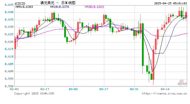 新浪外汇消息2025年04月25日,截至05时00分,外汇市场上澳元兑美元汇率突破1澳元兑换0.6402美元。涨幅为0.6699%