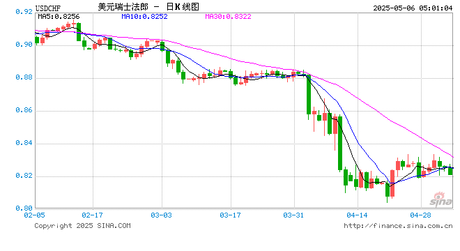 新浪外汇消息2025年05月06日,截至05时00分,外汇市场上美元兑瑞士法郎汇率跌破1美元兑换0.8210瑞士法郎。跌幅为-0.6426%