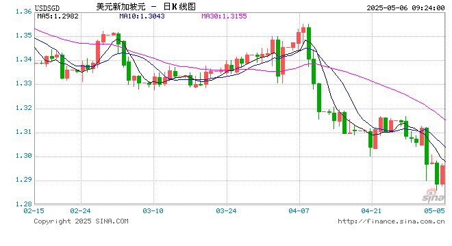 新浪外汇消息2025年05月06日,截至09时18分,外汇市场上美元兑新加坡元汇率突破1美元兑换1.2954新加坡元。涨幅为0.5082%