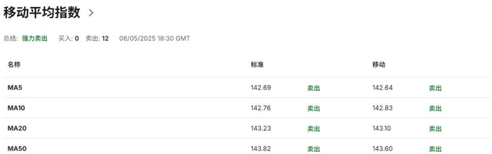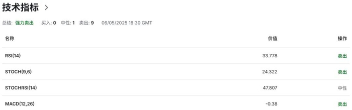 技术指标MACD读数12,16呈现空头排列,RSI读数29.40处于超卖区域,移动平均指数及震荡指标均显示强烈卖出信号,指标综合结果显示美日汇率走势仍偏向弱势,缺乏上行动能。