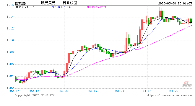 新浪外汇消息2025年05月08日,截至05时00分,外汇市场上欧元兑美元汇率跌破1欧元兑换1.1301美元。跌幅为-0.6226%