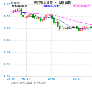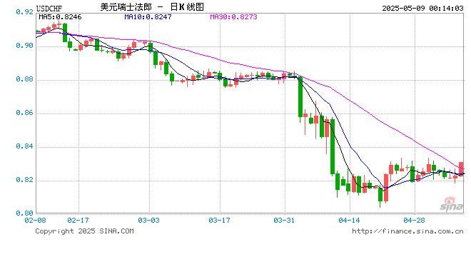 新浪外汇消息2025年05月09日,截至00时13分,外汇市场上美元兑瑞士法郎汇率突破1美元兑换0.8308瑞士法郎。涨幅为1.0029%