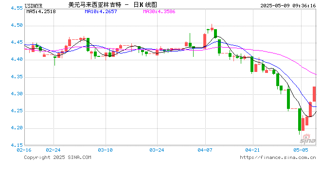 新浪外汇消息2025年05月09日,截至09时35分,外汇市场上美元兑马来西亚林吉特汇率突破1美元兑换4.3220马来西亚林吉特。涨幅为1.0521%