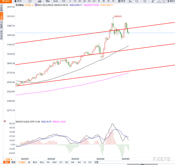 布林带轨道呈现收窄态势,显示市场进入整理期。若金价能有效突破3350美元前高,下一目标将指向3400美元关口;若跌破3270美元支撑位,短期内或向3200美元寻求支撑。整体来看,黄金短期走势偏强,但技术形态提示需防高位震荡回落风险。
