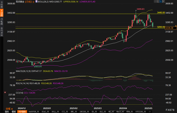 从日线图分析来看,黄金价格正在经历严峻考验。目前价格已跌至3220美元水平,逼近3200美元的重要心理关口。图表显示,价格已跌破重要支撑位3250美元,并在3200美元上方寻求企稳。
