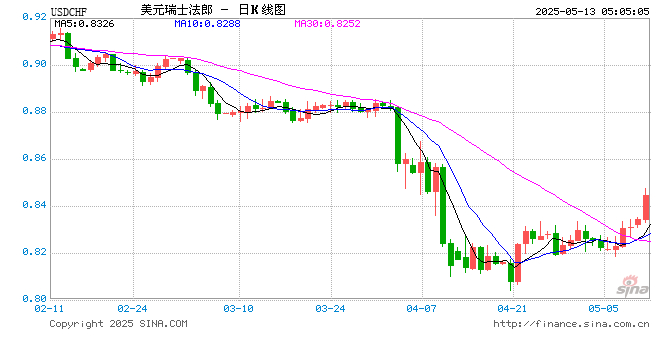 05月13日 美元兑瑞士法郎突破0.8447 折算100瑞士法郎汇率兑850.3700人民币