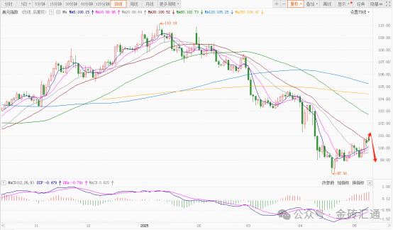 美元指数从100.15的低点一路上涨到110.18的次高点后,再次开启承压回落的走势。目前整体价格跌破并运行在MA250下方,并且跌破100的整数关口,呈明显的空头趋势。日内短线行情则建议看空震荡回落的走势。