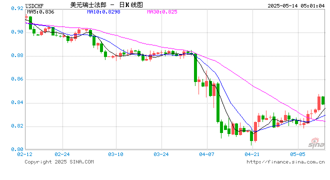 新浪外汇消息2025年05月14日,截至05时01分,外汇市场上美元兑瑞士法郎汇率跌破1美元兑换0.8391瑞士法郎。跌幅为-0.7546%
