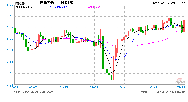 新浪外汇消息2025年05月14日,截至05时10分,外汇市场上澳元兑美元汇率突破1澳元兑换0.6468美元。涨幅为1.5305%