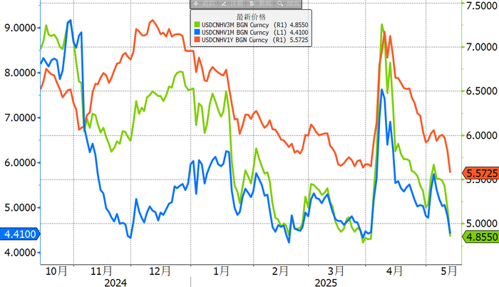 通胀数据平稳,且接下来的90天进入关税博弈的空窗期,反映到期权波动率,各期限波动率均大幅下跌。人民币预计将在7.20附近开启震荡,趋势行情难出现。
