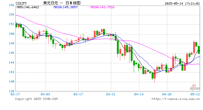 新浪外汇消息2025年05月14日,截至17时21分,外汇市场上美元兑日元汇率跌破1美元兑换145.9650日元。跌幅为-1.0051%