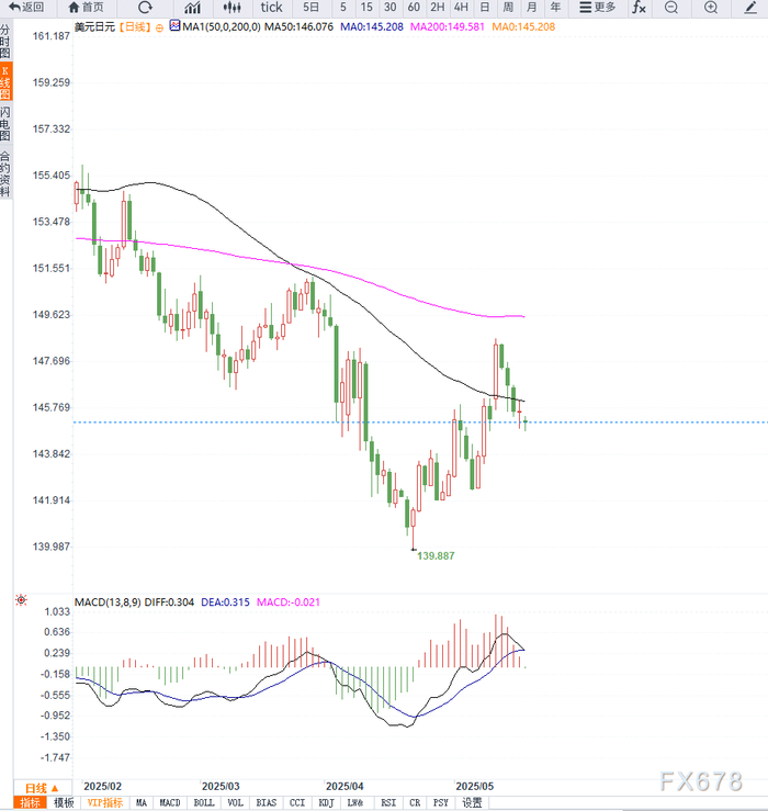 从日线图来看,美元兑日元(USD/JPY)在145.00附近得到支撑后呈现反弹迹象,但整体保持自147.80高点以来的下行通道。目前汇价徘徊于20日均线下方,5日与10日均线仍呈空头排列,显示上方抛压未消。