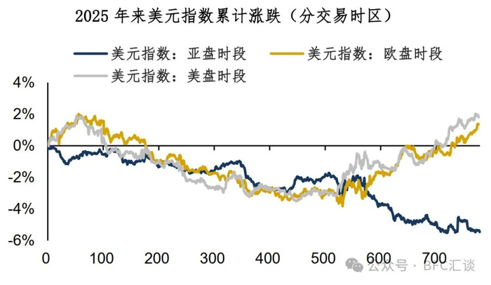 此外,美元指数的交易时区分析也指向了同样的结论——近期DXY的反弹全部集中在美盘时段,而亚盘时段的美元并未摆脱颓势。这表明许多亚系资金仍然选择离开美国。