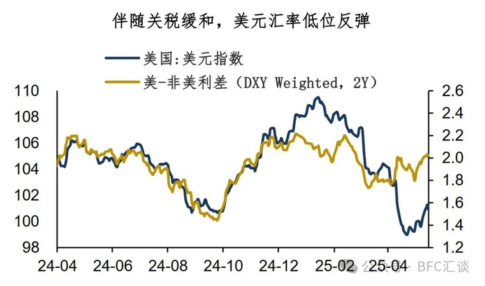 首先看关税这条线,这条线支撑美元汇率反弹。毕竟中美日内瓦谈判显著超预期,中美进入阶段性稳态。这显然有利于美元资产情绪修复,美股&美元反弹。这块的市场讨论已经很多,我们不再赘述。