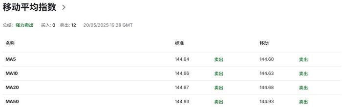 而下方主要支撑仍位于144.25水平,该水平为4月22号至5月12(139.88-148.65)号反弹上行趋势中斐波纳奇50%回调位,技术上构成较强支撑带。短期内仍需有效跌破至该水平下方,多空防守恐发生转换,有望进一步推动汇价向下测试5月7日的低点142.35水平区域以寻求再次巩固。
