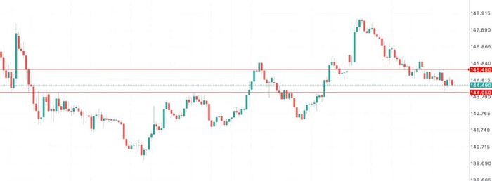 4小时级别来看,美日汇率自周一以来受阻于145.45水平区域,该水平区域为周一开市跳空的价格缺口,技术上形成较强阻力带。美日汇价需4小时价格收于该水平上方才有机会继续挑战上周五的高点146.10水平。若汇价再此获得进一步突破,才有机会继续上行测试147.10区域。