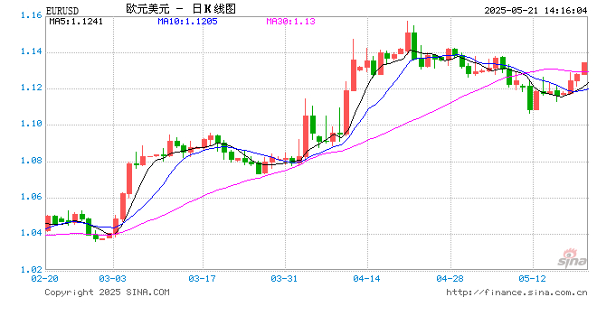 新浪外汇消息2025年05月21日,截至14时15分,外汇市场上欧元兑美元汇率突破1欧元兑换1.1344美元。涨幅为0.5371%