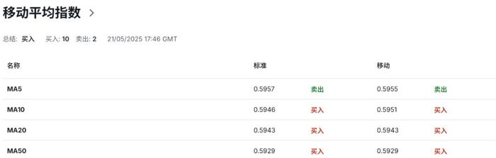 消息公布后,美元指数(DXY)连续三个交易日下跌。21日期间,市场对美元抛售的行为,表示美元指数为特朗普此前的政策性波动付出沉重代价,因而美元指数再度失守100美元关口,刷新低位至99.60附近区域水平,从而继续为纽币汇价反弹提供有效支撑。在美元政策波动的影响之下,纽币在昨日突破0.5935区域阻力,并刷新5月14日以来高点至0.5968价位水平。值得注意的是,这是纽币自5月8日有效跌破0.5935区域后,当前首次将收盘价格站上该区域上方。技术性买盘驱动力或将有望延续纽币短期反弹上行走势。