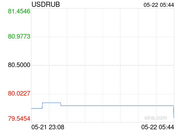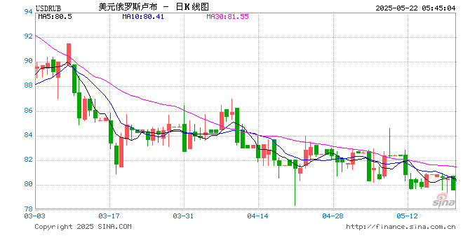 05月22日 美元兑俄罗斯卢布跌破79.6250 折算100俄罗斯卢布汇率兑8.9710人民币