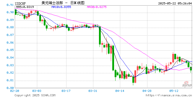 新浪外汇消息2025年05月22日,截至05时26分,外汇市场上美元兑瑞士法郎汇率跌破1美元兑换0.8239瑞士法郎。跌幅为-0.5060%