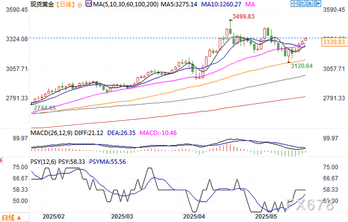 现货黄金日线图 来源:易汇通北京时间5月22日11:31 现货黄金 报 3339.83 美元/盎司
