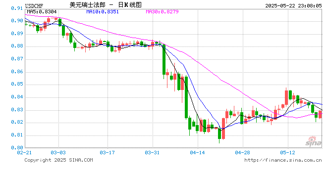 新浪外汇消息2025年05月22日,截至23时08分,外汇市场上美元兑瑞士法郎汇率突破1美元兑换0.8296瑞士法郎。涨幅为0.5381%