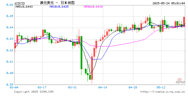 新浪外汇消息2025年05月24日,截至05时00分,外汇市场上澳元兑美元汇率突破1澳元兑换0.6494美元。涨幅为1.3231%