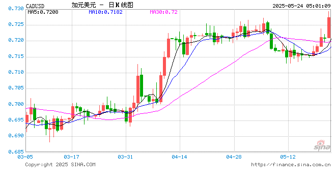 新浪外汇消息2025年05月24日,截至05时00分,外汇市场上加元兑美元汇率突破1加元兑换0.7273美元。涨幅为0.8878%