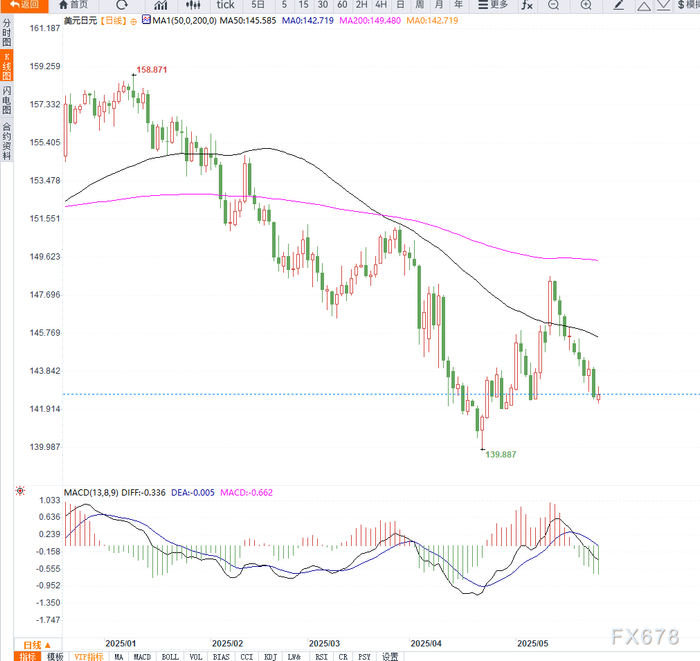 从日线图形来看,美元兑日元(USD/JPY)维持弱势格局,自上周跌破4月–5月升势的61.8%斐波那契回撤位后,反弹受限于143.00关口,形成短期下行通道。