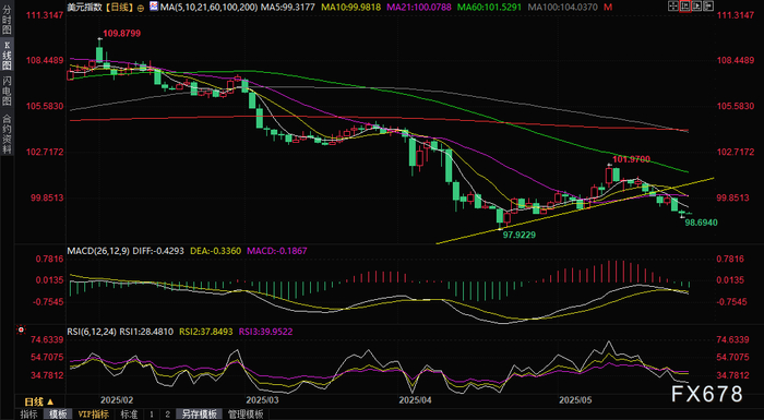 美元指数周一曾跌至99.69,为4月29日以来新低,也给金价提供支撑。因阵亡将士纪念日,美股周一休市,但股指期货上涨逾1%,泛欧股票指数STOXX回升至特朗普周五意外发出关税威胁前的水平,欧元升至4月底以来的最高水平。