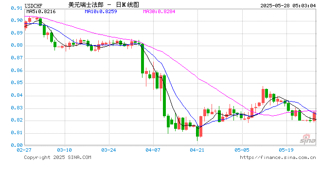 新浪外汇消息2025年05月28日,截至05时02分,外汇市场上美元兑瑞士法郎汇率突破1美元兑换0.8268瑞士法郎。涨幅为0.7444%