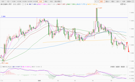 美元对人民币的离岸价经过多次震荡运行,从前期低点6.9651开始再次震荡上涨,目前突破并运行在在MA250均线上方;价格并在4月8日创出7.4287的新高后,出现明显承压回落走势,日内短线行情则建议看空震荡回落的走势。