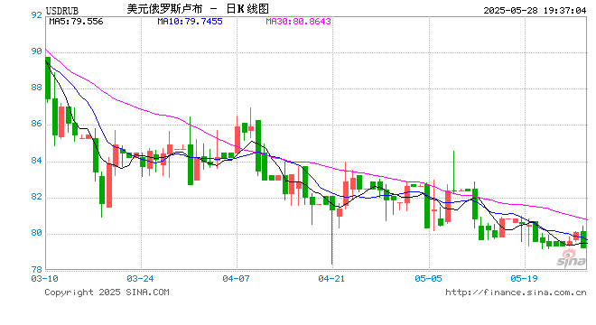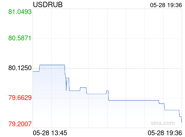 05月28日 美元兑俄罗斯卢布跌破79.2800 折算100俄罗斯卢布汇率兑8.9960人民币