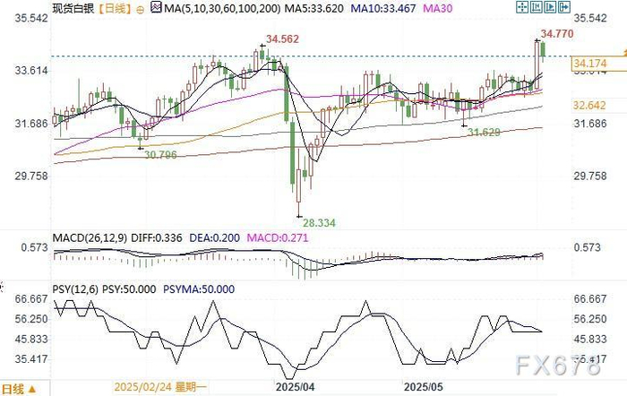 现货白银日线图 来源:易汇通北京时间6月3日13:15 现货白银 报 34.174 美元/盎司
