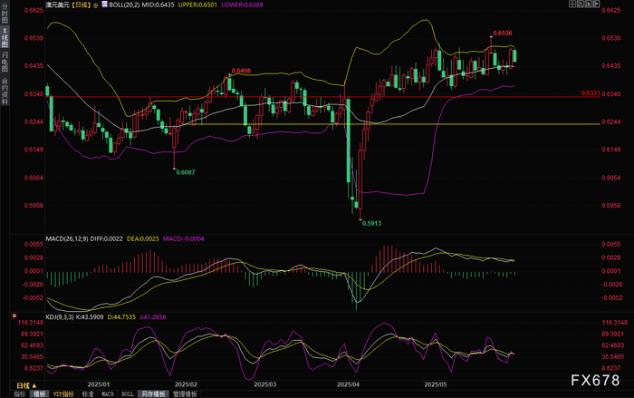 值得注意的是,澳大利亚第一季度核心通胀率已回落至2.9%,自2021年底以来首次回到RBA设定的2%-3%目标区间。决策者预计,到2025年底,核心通胀率将进一步降至2.6%。这一进展为降息提供了国内依据,而全球不确定性则进一步强化了宽松政策的必要性。市场预计,RBA在7月8日的下次会议上再次降息的可能性约为77%,且到2026年初,利率可能降至3.10%或更低,接近中性政策水平,即既不刺激也不抑制经济增长。